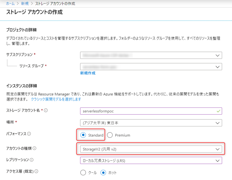 サブスクリプションやリソースグループは保有する環境に合わせて選択、もしくは作成してください。ストレージアカウント名はここでは「serverlessformpoc」としました。