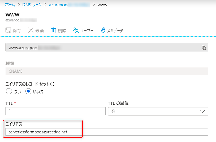 2-2 「2」と同様の要領で、「cdnverify」CNAMEレコードを登録し、値をCDNエンドポイントのFQDN(ここでは serverlessformpoc.azureedge.net)とすることで、本番環境に影響なく検証することが可能です。
