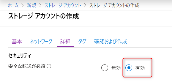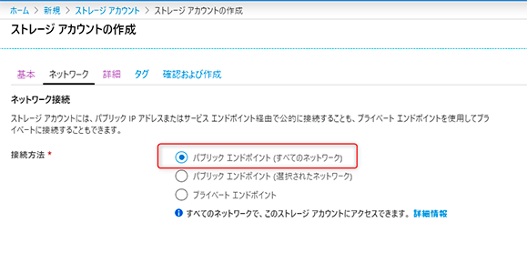 また、以下の通り「安全な転送が必須」の項目が有効であることと、「接続ポイント」がパブリックエンドポイント(すべてのネットワーク)になっていることを確認してください。