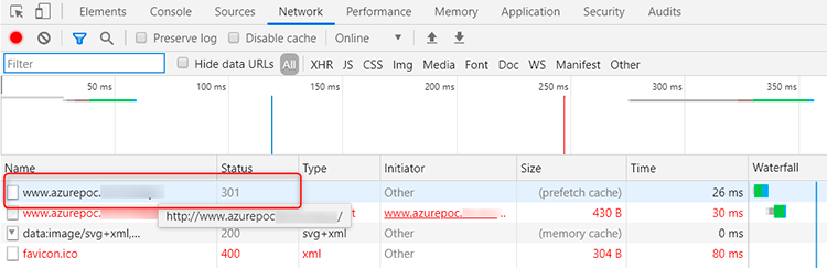 Google Chromeの開発機能を使ってリクエストの様子を見てみると、Rules Engineで設定した通りレスポンスコード301が返っていることが確認できます。