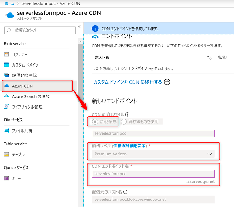 Azure上でのCDNの識別名(ここでは serverlessformpoc)、価格レベルを「Premium Verizon」、エンドポイント名(ここでは serverlessformpoc)を入力し、CDNを作成します。