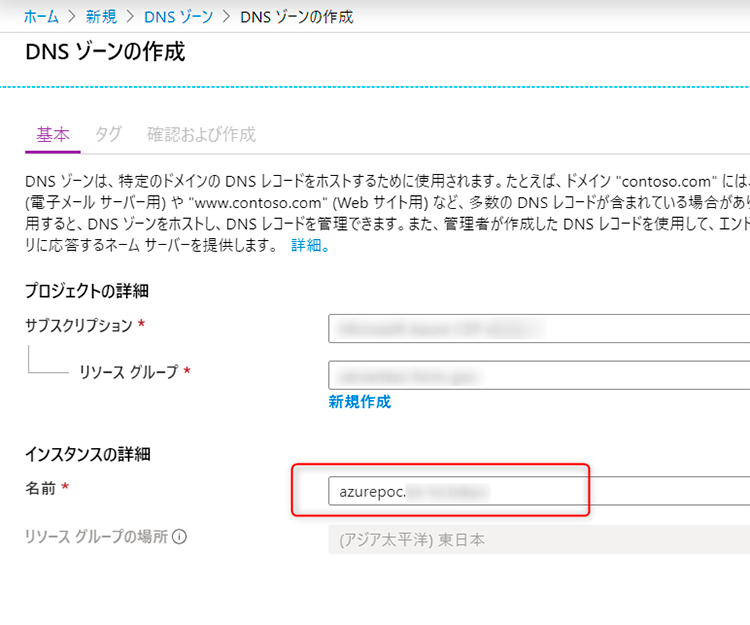 Azure DNSゾーン上に、保有しているドメインの登録を実行します。 セキュリティの観点から、画像上DNSゾーン名の一部にマスクをかけています。
