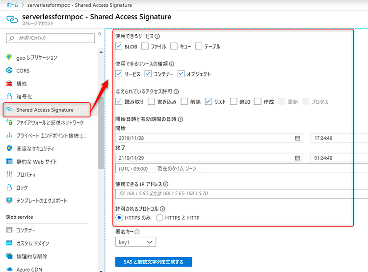カスタムドメインHTTPSが有効化されるのを待っている間、BlobストレージからShared Access Signature (SAS)トークンを発行しておきましょう。 これはCDNからBLOBに対しての読み取りアクセスを有効化するために必要です。