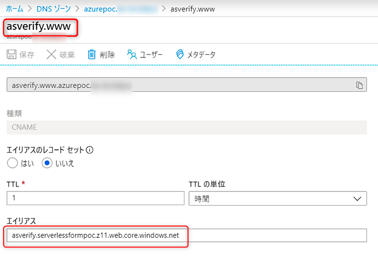 Azure DNSゾーンに移動し、「asverify.www」というCNAMEレコードを「asverify.serverlessformpoc.z11.web.core.windows.net」向けに設定します。