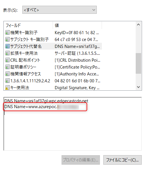 ホストされている証明書を確認すると、サブジェクト代替名にカスタムドメインが設定されていることを確認できます。