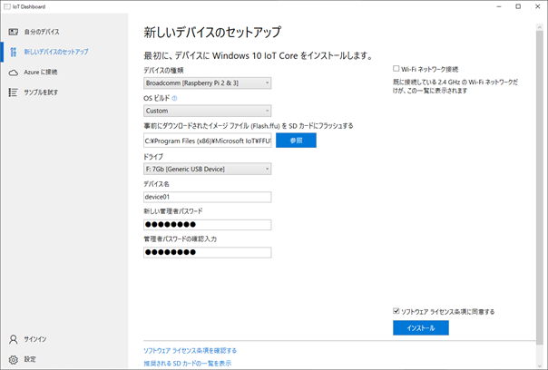 ディスクイメージは microSD カードに書き込みます。イメージを書き込むツールは Windows 10 IoT Core ダッシュボードです。ダウンロードしてインストールしてください。イメージはダッシュボードが自動的にダウンロードします。