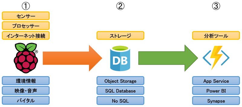 従って、IoT システムのコンポーネントは①デバイス、②ストレージ、③分析ツールからなります。