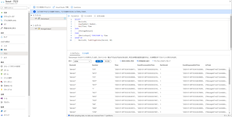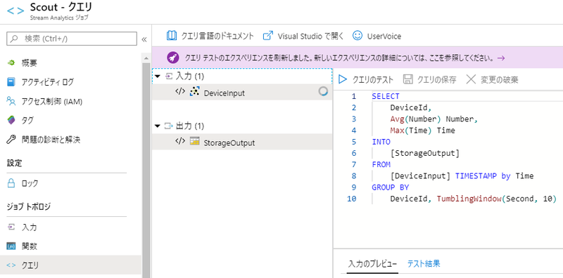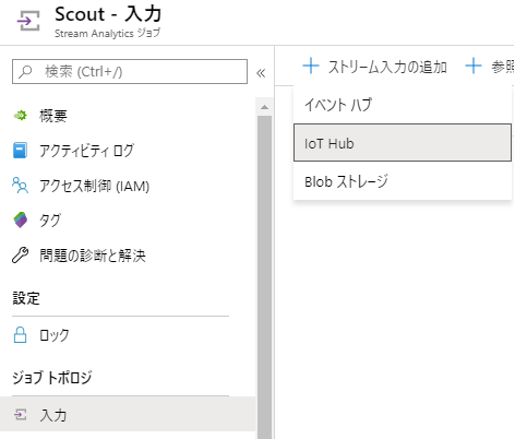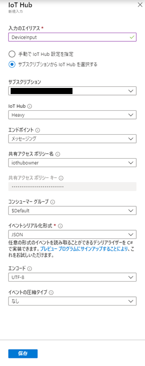 Stream Analytics では、入力元である IoT Hub からテレメトリーを取得し、出力先である Storage Account に格納するジョブを設定します。