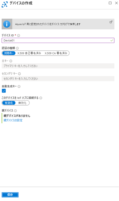 本来は自動採番が望ましいですが、今回はデバイス名はDevice01にします。この名前はデバイス側のアプリでも使用します。