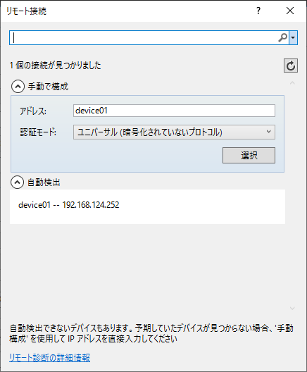 デバイスと同一セグメント上にいれば自動検出しますが、検出に失敗したら手動で IP アドレスを入力してください。