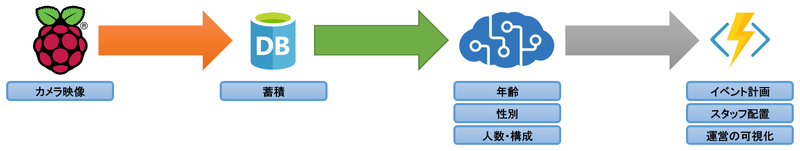 C社はショッピングモールを経営しています。モールにはさまざまな属性の人がさまざまなシーズン・時間帯に来ますが、この傾向を予測することでモールの活性化につなげたいと考えています。モールには監視カメラが設置してあり、Azure Face API で来訪者の年齢・性別・メンバー構成を収集し、どんな属性の人がどんな時間帯にどこに来るのか分析します (人流分析)。この情報をもとに、いつどんなイベントを実行するのが効果的か、警備員や店舗スタッフの人数の適正化など、これまで勘と経験に頼ってきた店舗運営を可視化することができます。