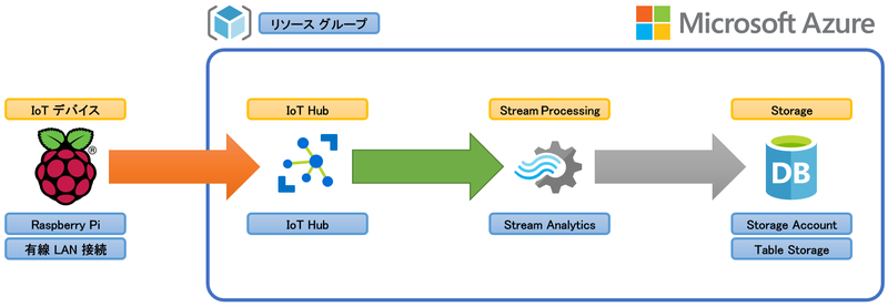 IoT システムの構成を検討します。今回は、センサに見立ててランダムなデータを定期的に送信するデバイスを想定します。分析はまたの機会にして、分析可能な形式で Azure にデータを保管するところまでにします。
