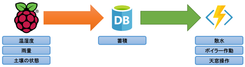 A社は農業法人で、運営している農地の環境情報を収集し、収率の向上や省力化につなげたいと考えています。環境センサから温湿度・雨量・土壌の状態を収集し、適切にスプリンクラーで散水させたり、ビニールハウスのボイラーを作動させたり、天窓を開けたりといった管理を自動化しましょう。デバイスからの情報を集積し、分析を行い、デバイスを作動させる一連の動きはまさに IoT システムです。