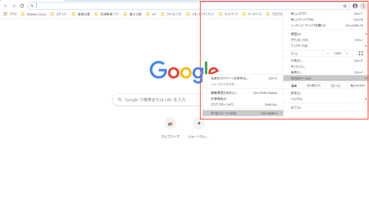 Step2: Chromeのメニューバーから「その他のツール(L)」>「デベロッパーツール(D)」を選択します。