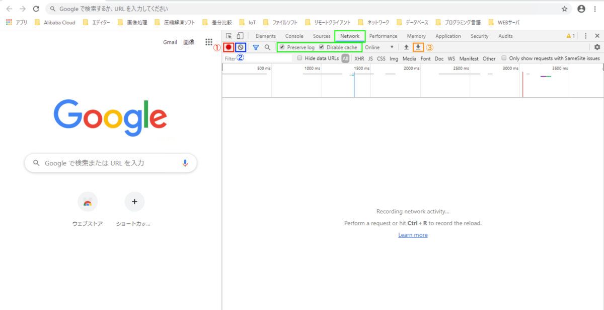 ※「Preserve log」ボックスにチェックがない場合、WEBサイトにてリダイレクトが起こった際に、リダイレクトする前のデータが記録されません。