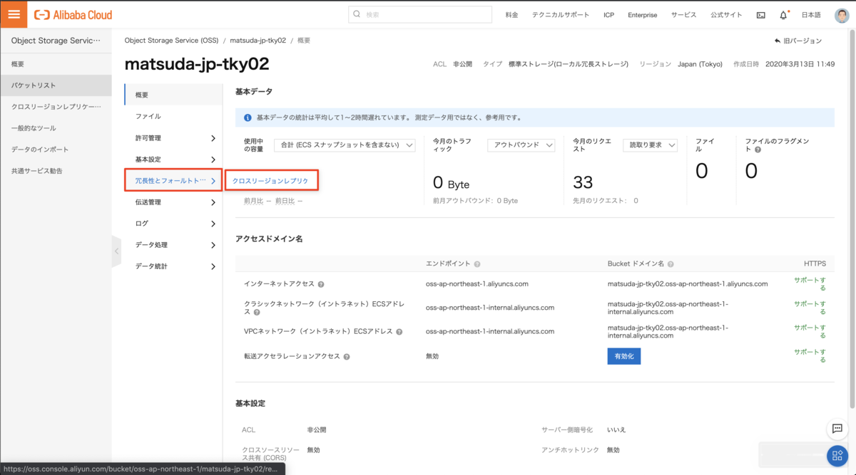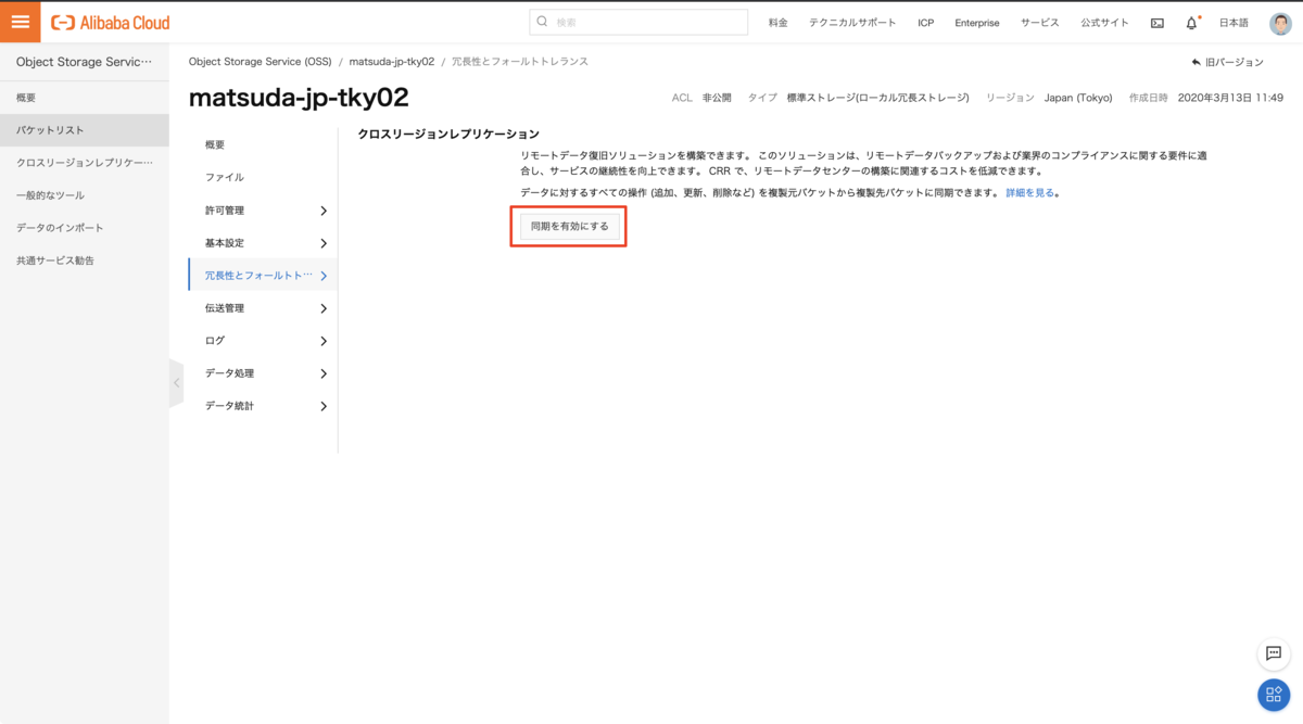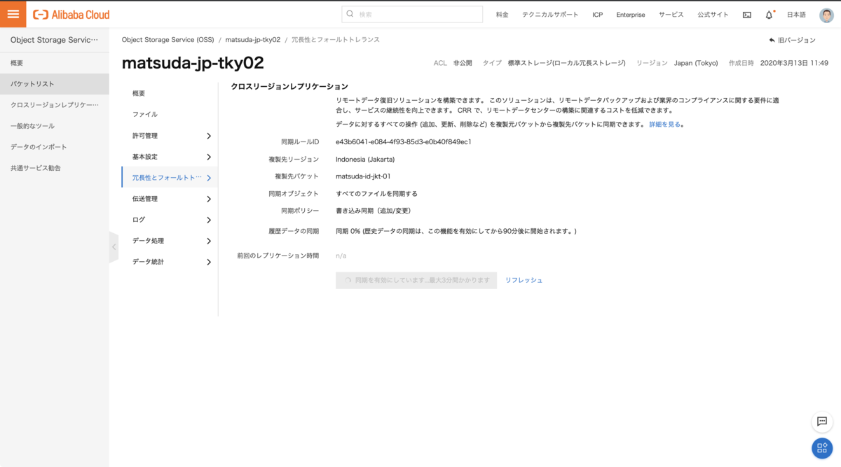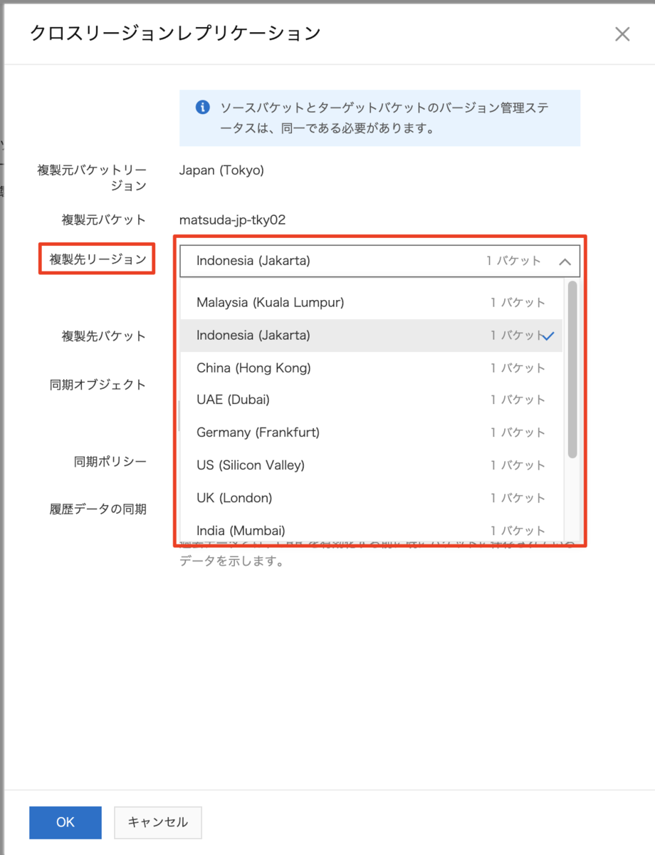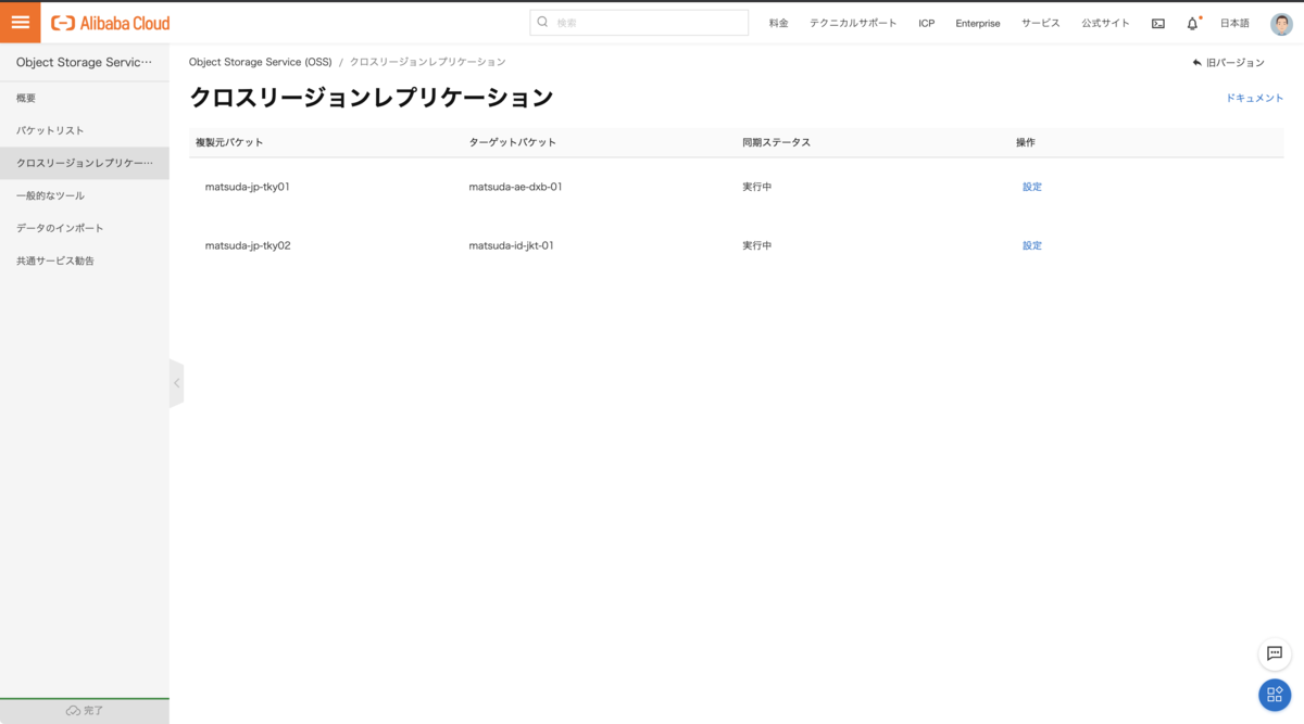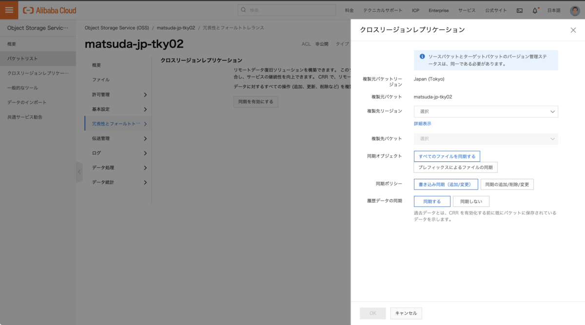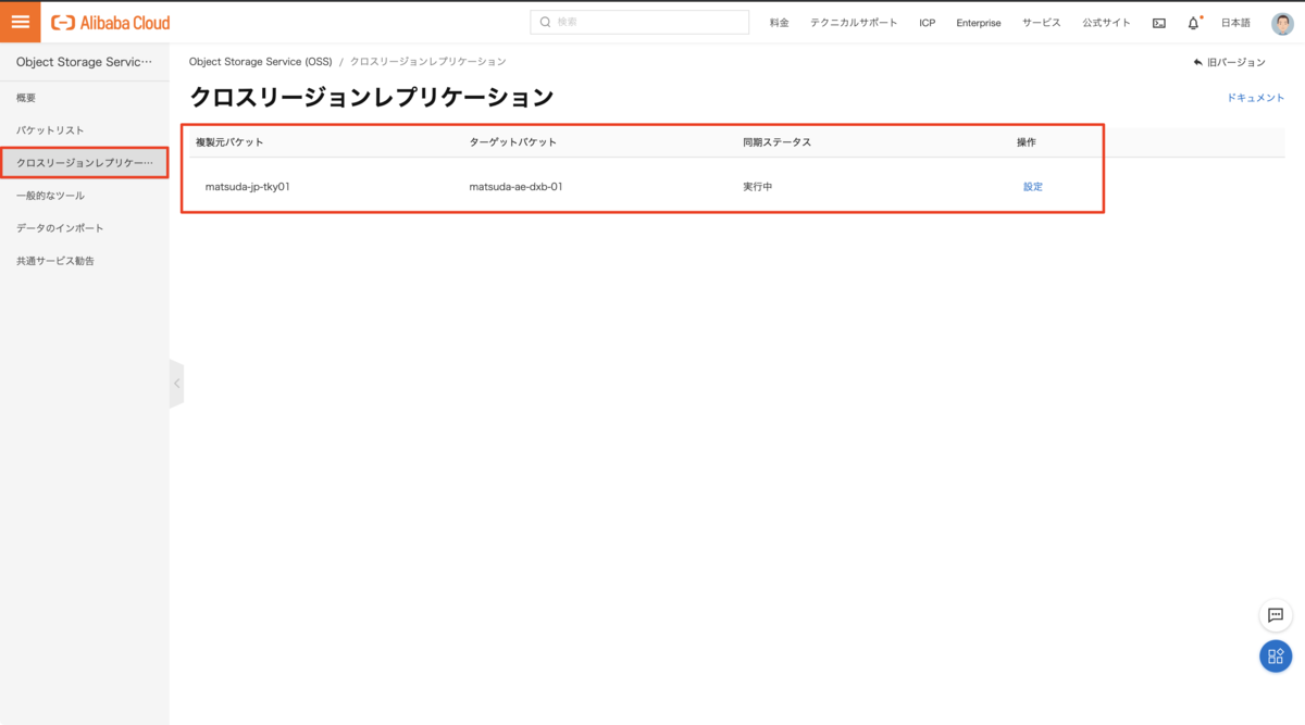 クロスリージョンレプリケーションが設定されている場合はココに設定助y方が表示されます。