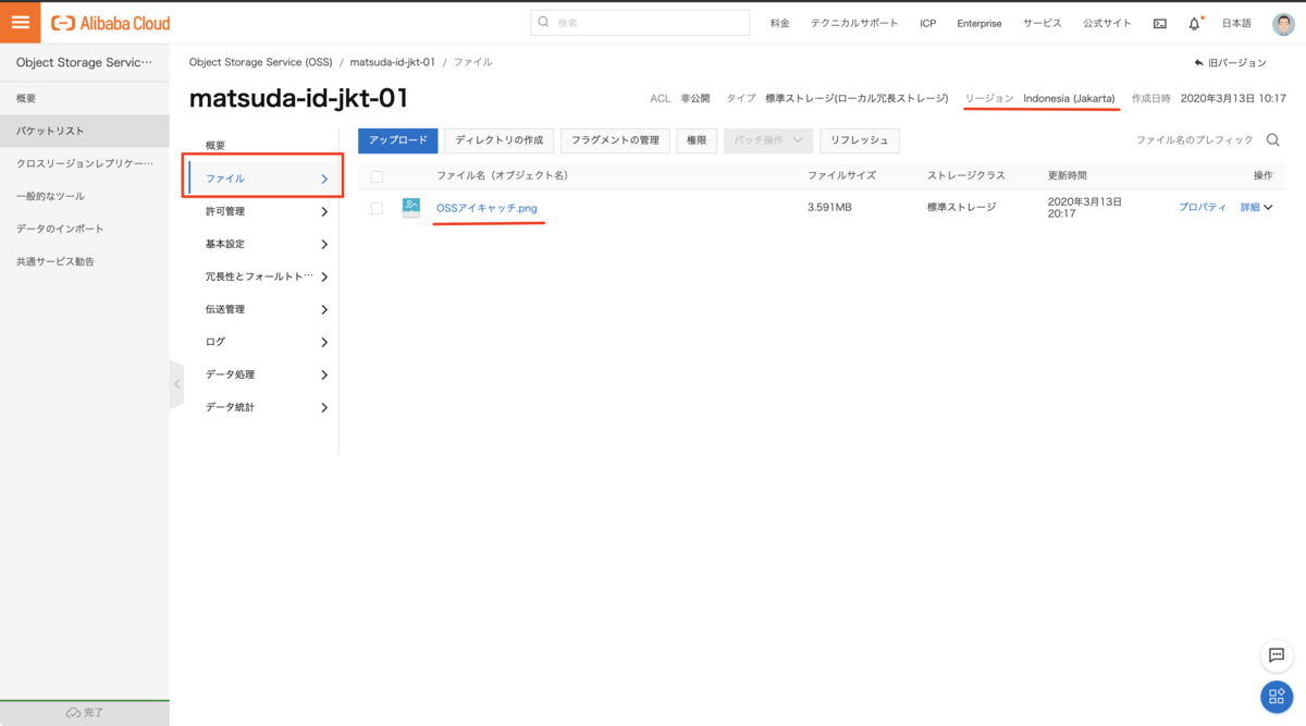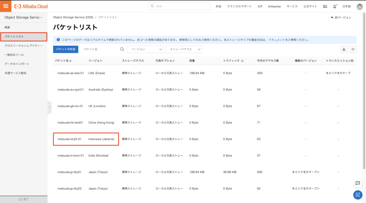 「バケットリスト」からIndonesia (Jakarta)の対象のバケットを選択します。