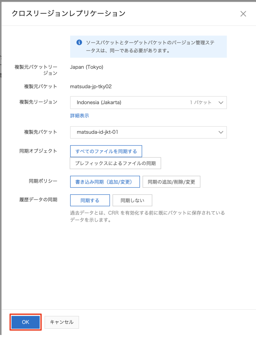 コレは地味に嬉しくて、複製元と複製先のバケットが一目でわかるので、複数のバケットを運用している時に便利ですね!