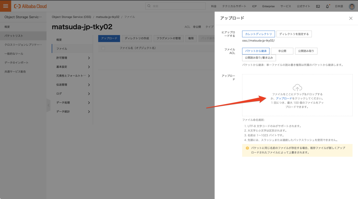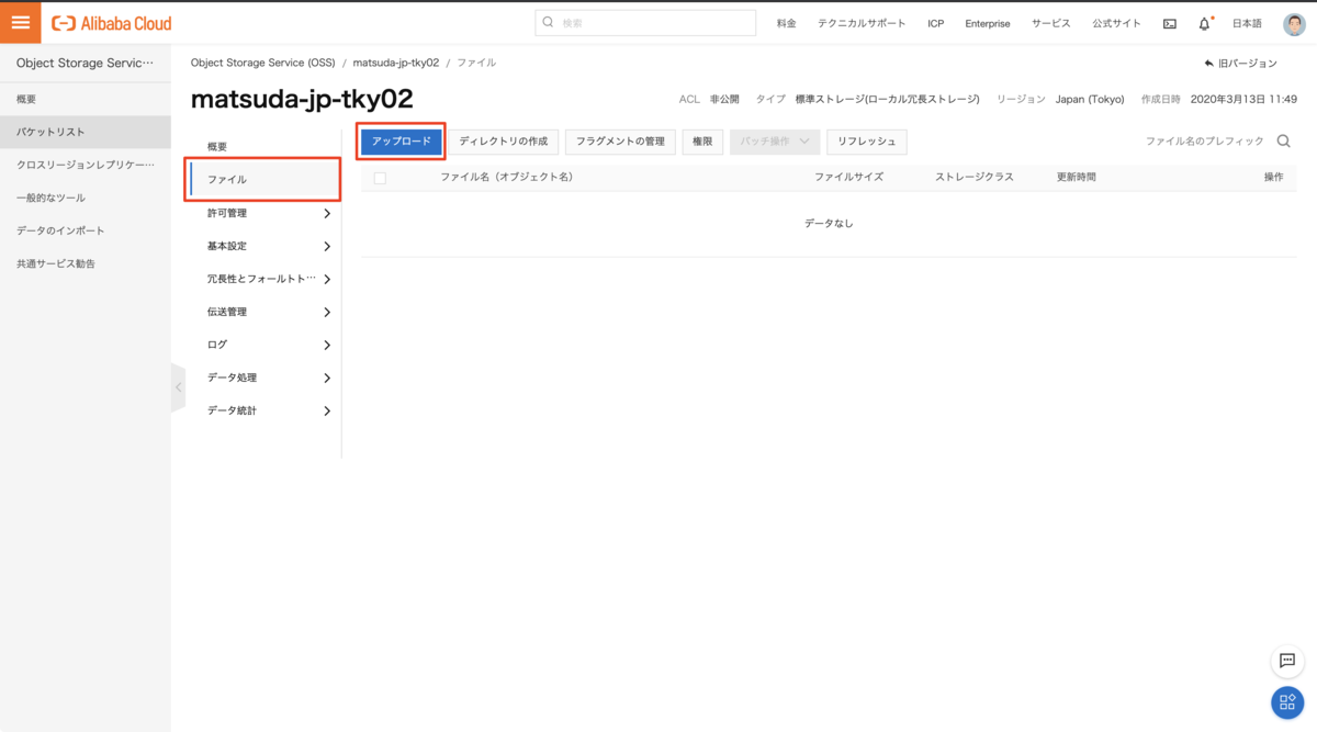 「アップロード」の項目を選択してアップロードするファイルを選択します。