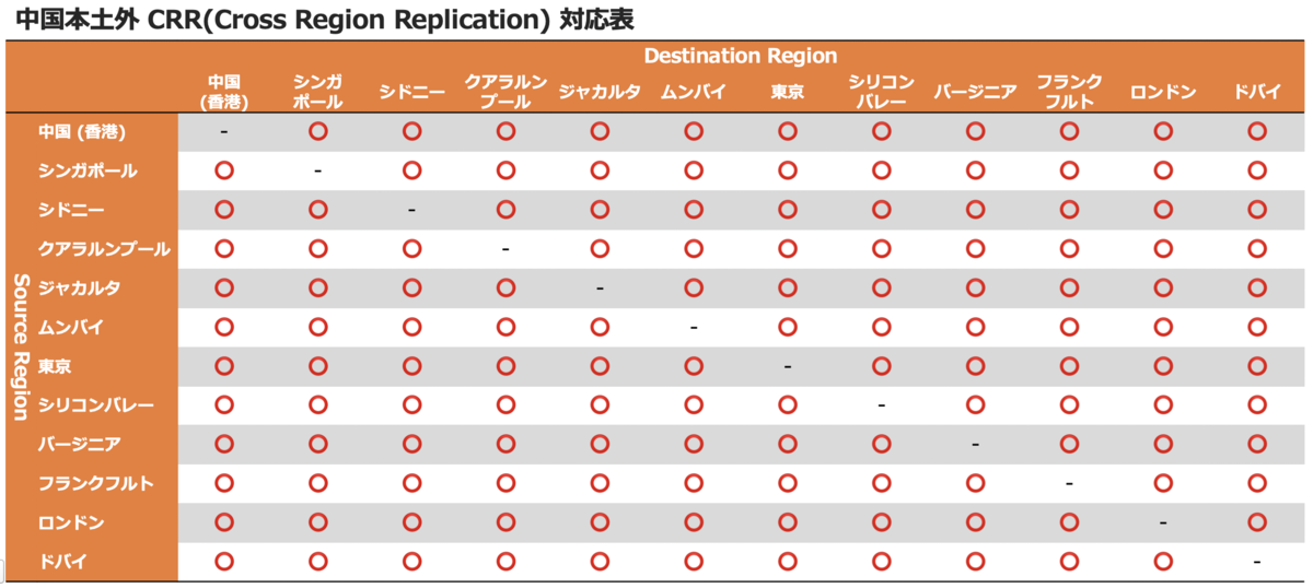 まだ、中国本土と中国本土外のレプリケーションは依然として出来ないのですが、対応しているリージョンが増えた事は嬉しいですね。