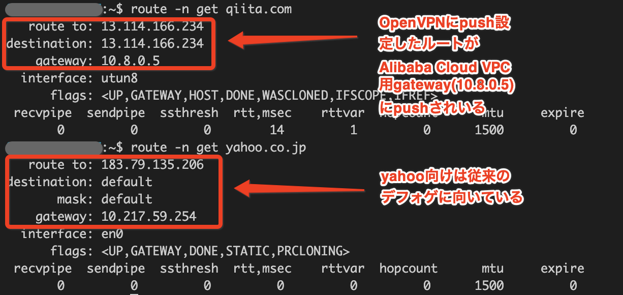 これでVPN接続時はAlibaba CloudのVPC網を通ってNATサーバからQiitaにアクセスするようになりました! 注意点としてIPアドレスが複数ある場合は、丸めて記載するか単体でそれぞれ記載するなど工夫が必要です。 OpenVPNがドメインで経路をpushできれば良さそうなんですけど、今のところはできなさそう...🤔