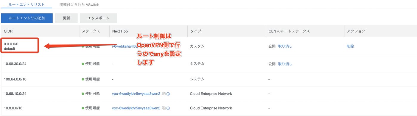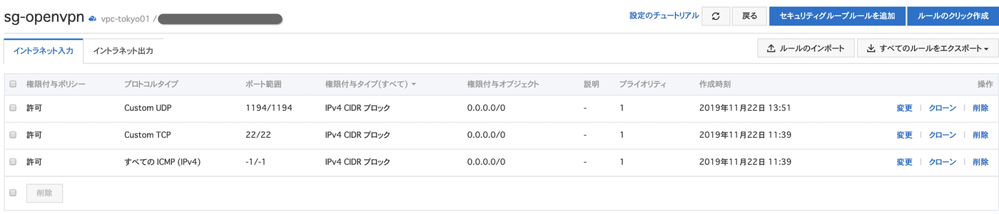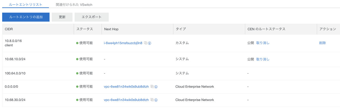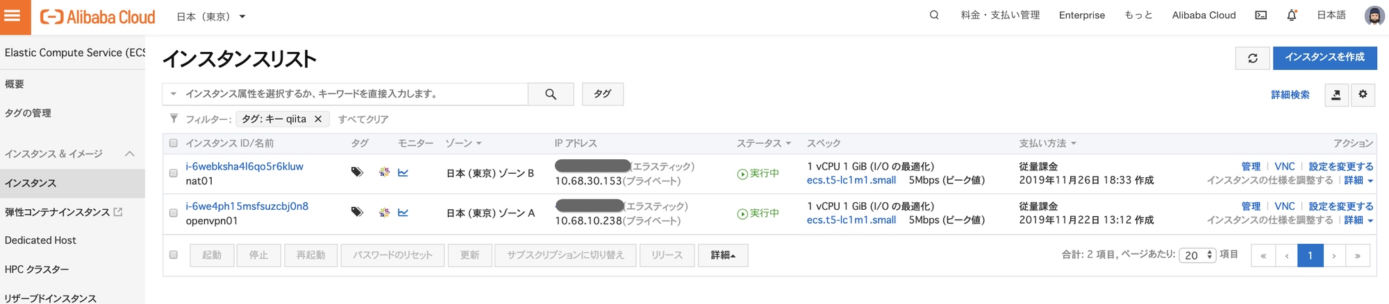 | VPNサーバ | openvpn01 | 日本東京(ゾーンA) | ecs.t5-lc1m1.small | 1vCPU 1GiB | 10.68.10.238 |