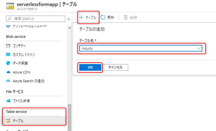 今回はテーブル名を「inquiry」とし、「OK」をクリックして Azure Table Storageを作成します。