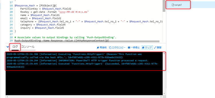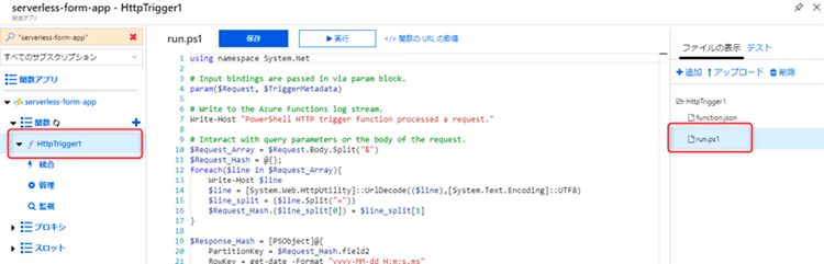 まずは自動作成された「run.ps1」を今回の Webフォームを受け取るための PowerShellコードに置き換えてみます。