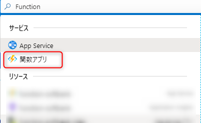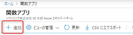 Azureポータル上部の検索バーに「Functions」と入力し、表示された「関数アプリ」をクリックし、表示された関数アプリのコンソールで「+ 追加」をクリックします。