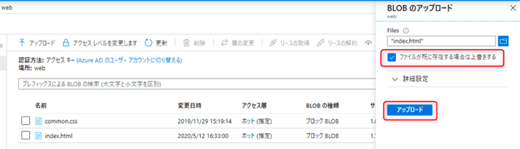 編集した index.htmlを BLOBストレージ上に再度アップロードします。前編で作成した Webコンテナーへ同名の「index.html」のままアップロードします。