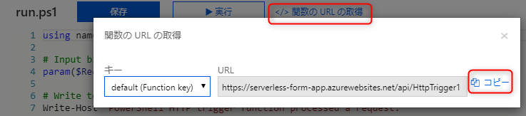 作成した関数のエンドポイントを取得します。先程保存した「run.ps1」が表示されている状態で、「</> 関数の URL の取得」をクリックし、ポップアップしたウィンドウ上で「コピー」をクリックします。