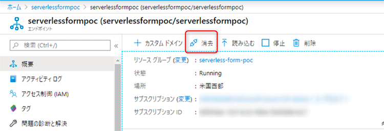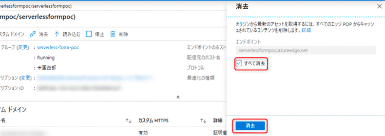 前編で立ち上げ済の CDNエンドポイントの概要コンソールから「消去」をクリックします。