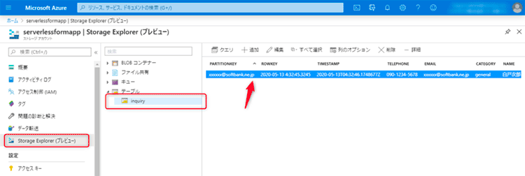 3.1で作成したストレージアカウントへ移動し、「Storage Explorer (プレビュー)」をクリック、inquiryテーブルを開きます。
