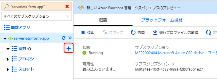 関数アプリのデプロイが完了したらリソースへ移動し、関数を作成します。左ブレードメニュー「関数」の右側にある「+」をクリックします。
