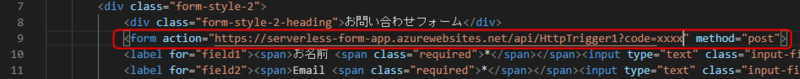 前編で作成済みの「index.html」Formタグの9行目<form>タグの actionへ取得した関数のURLをペーストします。method="post"となっている点も念のため確認してください。
