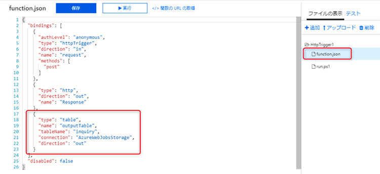 作成が完了したら再度「function.json」を開き、Azure Table Storageへの出力設定が追加されている事を確認します。
