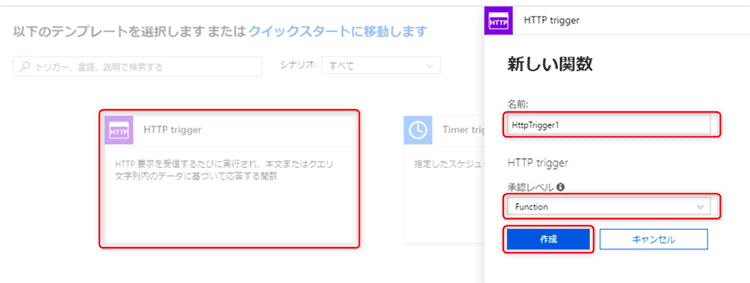 HTTPトリガーを選択し、任意の名称(ここでは HttpTrigger1)、承認レベル「Function」を選択し、「作成」をクリックします。