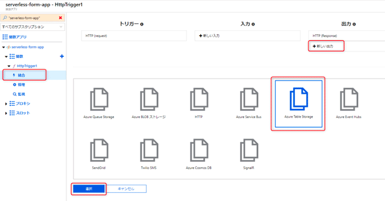 HttpTrigger1関数に戻り、統合から 「+ 新しい出力」をクリックし、Azure Table Storageを選択の上、「選択」をクリックします。