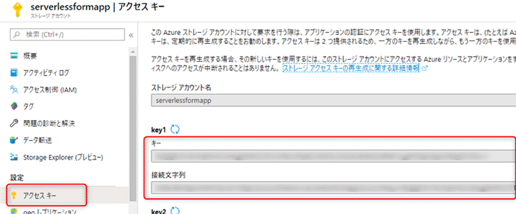 念のため、ブレードから「アクセス キー」を開き Key1, Key2それぞれの「キー」と「接続文字列」を控えておいてください。