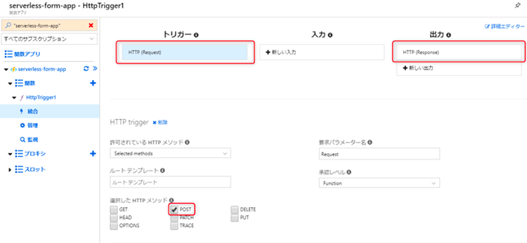 作成した関数の「統合」から、トリガーが「HTTP(request)」、出力が「HTTP(Response)」となっている事を確認します。