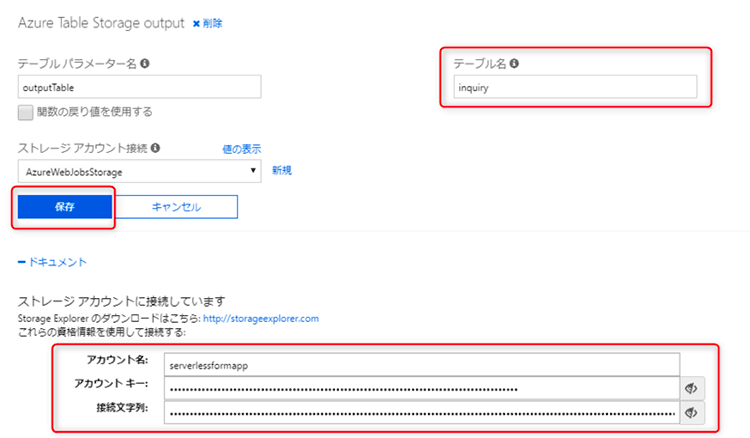 これで Azure Table Storageへ出力するための設定準備が完了しました。 早速コードを改修し、出力を試してみましょう。