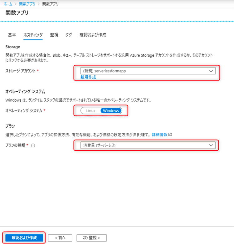 ストレージアカウントはここでは「serverlessformapp」として新規作成します。