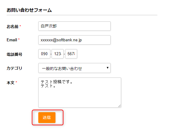 ここまでの作業が完了したらいよいよフォームからデータを送信してみます。Webブラウザ上のフォームへダミーデータを入力し、送信ボタンをクリックします。