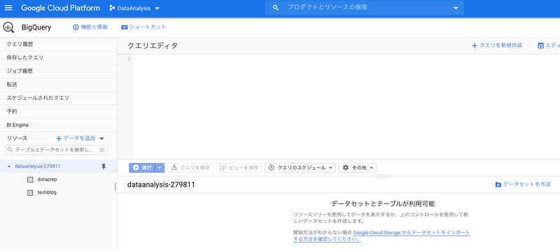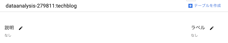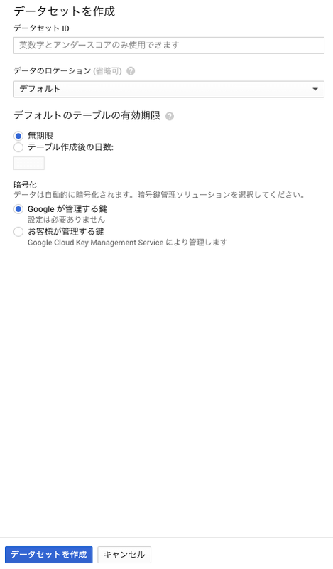 データセットは複数のテーブルを格納するフォルダのようなイメージです。初期状態ではデータセットが何も無いので、データセットの作成から開始します。