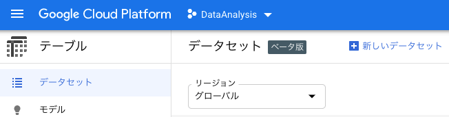 「新しいデータセット」をクリックし、任意のデータセット名を設定して、リージョンはグローバルのまま「データセットの作成」をクリックします。
