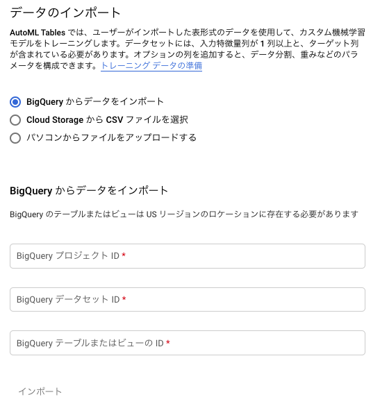 「BigQuery からデータをインポート」を選択し、それぞれのIDを入力します。