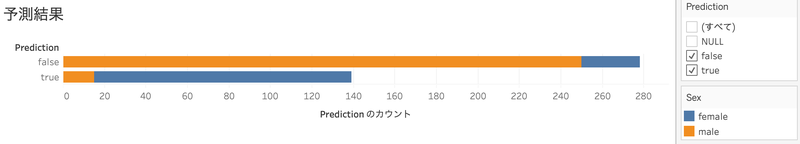 学習データの分析の際に確認した分布よりも、女性の生存者の割合が増えているように見えます。予測結果の確認の際に必須なのは、実際のデータとの答え合わせです。