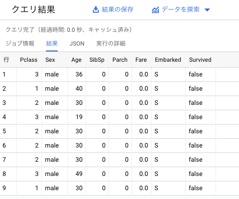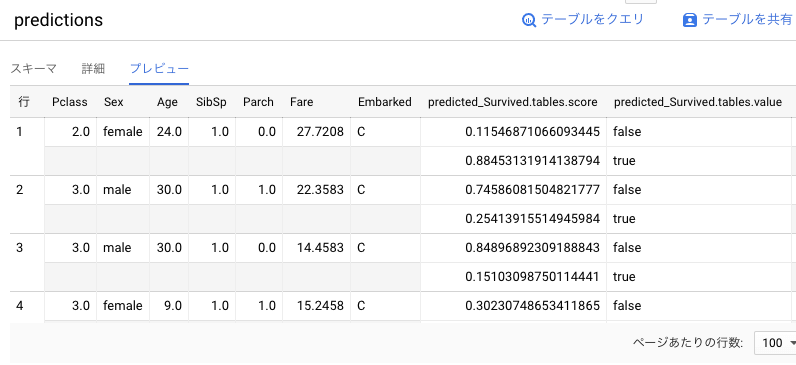 処理が完了すると、BigQuery の指定した場所にテーブルが作成されます。PassengerIdごとに、どのように予測を行ったかが確認できます。scoreが、trueまたはfalseのどちらを強く判定したかの指標で、基本的にはscoreの高い方を予測結果として採用します。