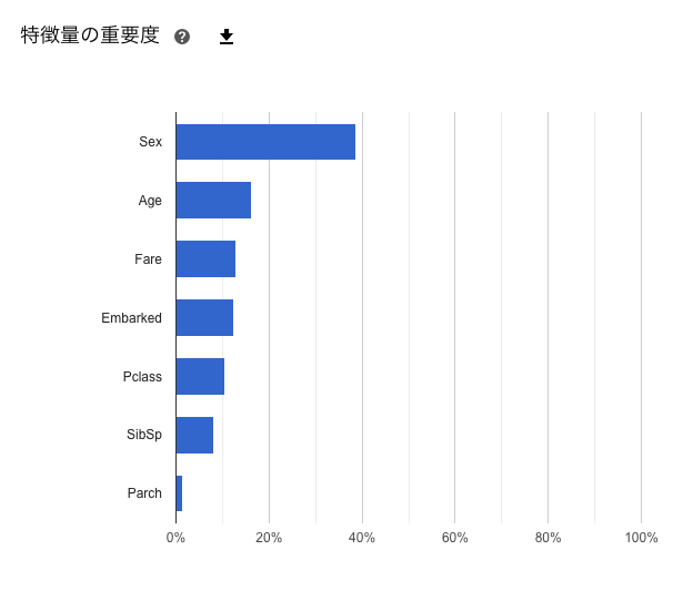 画面上に多くの指標があり、混乱するかと思われます。それぞれ「?」マークをクリックすることで、解説が表示されます。ページの下部では、「特徴量の重要度」という項目があり、学習したデータのうち、どのデータが予測対象に大きく関係しているかを大まかに把握することができます。事前の分析でも仮説を立てていたように、性別による影響が大きいことが分かります。