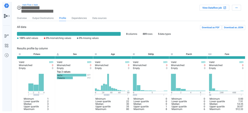 前編で作成した前処理済みデータをDataprep のJobsから確認(Profileを選択)すると、「最小値(Minimum)」「下四分位値(Lower quartile)」「中央値(Median)」「上四分位値(Upper quartile)」「最大値(Maximum)」といった基本統計量や、データの分布をヒストグラムで確認することができます。